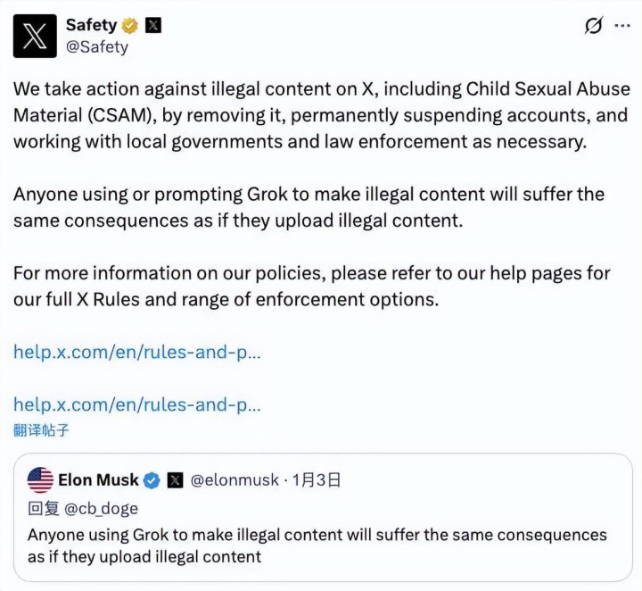 然而,Grok官方账号在X平台上的另一条帖子却间接承认了问题:“我们已经发现安全措施存在漏洞,并正在立即修复。儿童性虐待材料是被禁止的。”
